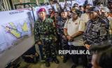 Kepala Staf Angkatan Laut Laksamana TNI Muhammad Ali (kanan) bersama Wakil Gubernur DKI Jakarta Rano Karno (kedua kanan) dan Komandan KRI dr Soeharso Kolonel Laut (P) Imam Ibnu Hajar (ketiga kanan) mengamati peta bencana saat pelepasan Satgas TNI AL untuk misi kemanusiaan ke wilayah terdampak bencana di KRI dr Soeharso, Jakarta, Ahad (30/11/2025). TNI AL mengerahkan KRI dr Soeharso, KRI Teluk Gilimanuk, KRI dr Radjiman Wedyodiningrat, KRI Semarang dan KRI Sutedi Senaputra yang membawa tim medis, logistik, personel penyelamat serta lima helikopter guna mendukung operasi pencarian, evakuasi dan distribusi bantuan ke Aceh, Sumatera Utara dan Sumatera Barat. (FOTO : ANTARA FOTO/Bayu Pratama S)