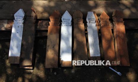 Papan nama jenazah korban longsor di Kampung Duren, Desa Batu Godang, Kecamatan Angkola Sangkunur, Kabupaten Tapanuli Selatan, Sumatera Utara, Ahad (30/11/2025). Jumlah korban meninggal tercatat paling tinggi ada di Sumatera Utara. Di wilayah tersebut, BNPB mencatat 173 orang meninggal dan 145 lainnya masih dalam pencarian. (FOTO : ANTARA FOTO/Yudi Manar)