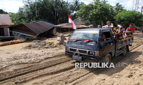 Warga mengendarai mobil meninjau rumah kerabatnya yang rusak akibat banjir bandang di Desa Aek Garoga, Kecamatan Batang Toru, Kabupaten Tapanuli Selatan, Sumatera Utara, Sabtu (29/11/2025). Pascabanjir bandang pada Selasa (25/11) lalu, warga mulai melakukan aktivitas seperti meninjau rumah warga yang rusak, mencuci pakaian dan kendaraan yang terkena lumpur. (FOTO : ANTARA FOTO/Yudi Manar)