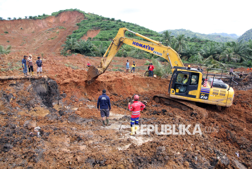 Petugas menggunakan alat berat melakukan pencarian korban longsor di Kampung Duren, Desa Batu Godang, Kecamatan Angkola Sangkunur, Kabupaten Tapanuli Selatan, Sumatera Utara, Ahad (30/11/2025). Berdasarkan data dari Desa Batu Godang sebanyak 16 orang meninggal dunia dan 6 orang belum ditemukan akibat bencana longsor pada Rabu (26/11). (FOTO : ANTARA FOTO/Yudi Manar)