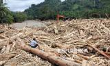 Warga mengamati sampah kayu gelondongan pasca banjir bandang di Desa Aek Garoga, Kecamatan Batang Toru, Kabupaten Tapanuli Selatan, Sumatera Utara, Sabtu (29/11/2025). Sampah kayu gelondongan tersebut menumpuk di pemukiman warga dan sungai pasca banjir bandang pada Selasa (25/11). (FOTO : ANTARA FOTO/Yudi Manar)