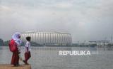 Anak sekolah berjalan di sekitar Area Waduk Cincin, Jakarta,Senin (1/12/2025). Waduk Cincin berfungsi menampung air untuk mencegah terjadinya banjir di permukiman sekitar, terutama saat musim hujan (FOTO : Republika/Prayogi)