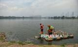 Petugas UPS Badan Air mengambil sampah di Area Waduk Cincin, Jakarta,Senin (1/12/2025). Dalam satu hari, petugas mampu mengangkut hingga sembilan kubik sampah dari Waduk Cincin. (FOTO : Republika/Prayogi)
