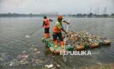Petugas UPS Badan Air mengambil sampah di Area Waduk Cincin, Jakarta,Senin (1/12/2025). Sampah-sampah yang diangkut merupakan sampah rumah tangga, plastik, hingga material organik yang terbawa aliran air. (FOTO : Republika/Prayogi)