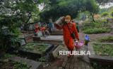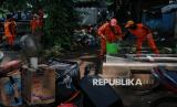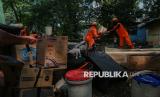 Petugas PPSU membantu membawa barang-barang milik warga yang tinggal di area Tempat Pemakaman Umum (TPU) Menteng Pulo II untuk direlokasi, di Jakarta, Selasa (2/12/2025). Pemerintah Provinsi DKI Jakarta merelokasi 105 KK yang bermukim di kawasan TPU Menteng Pulo II ke Rusunawa Jagakarsa sebagai upaya mengembalikan kembali fungsi lahan dan pemakaman sebagaimana mestinya. (FOTO : Republika/Thoudy Badai)