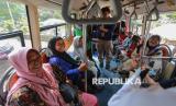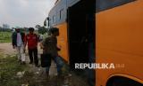 Warga menaiki bus untuk direlokasi ke Rusunawa Jagakarsa di Tempat Pemakaman Umum (TPU) Menteng Pulo II, Jakarta, Selasa (2/12/2025). Pemerintah Provinsi DKI Jakarta merelokasi 105 KK yang bermukim di kawasan TPU Menteng Pulo II ke Rusunawa Jagakarsa sebagai upaya mengembalikan kembali fungsi lahan dan pemakaman sebagaimana mestinya. (FOTO : Republika/Thoudy Badai)