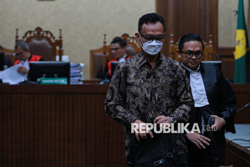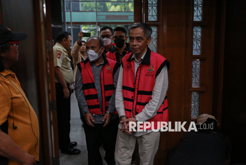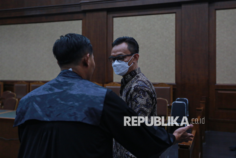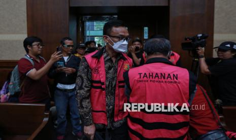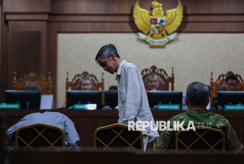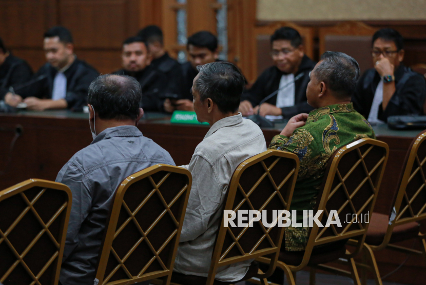 Terdakwa kasus dugaan suap terhadap putusan lepas perkara korupsi pemberian fasilitas ekspor minyak sawit mentah (CPO) Agam Syarif Baharudin (kanan), Ali Muhtarom (kiri) dan terdakwa lainnya bersiap menjalani sidang pembacaan putusan di Pengadilan Tipikor, Jakarta, Rabu (3/12/2025). Majelis hakim memvonis ketiga terdakwa mantan hakim yang menjatuhkan vonis lepas (ontslag) terhadap kasus korupsi pemberian fasilitas ekspor minyak sawit mentah (crude palm oil/CPO) yakni Djuyamto, Agam Syarif Baharudin, dan Ali Muhtarom dengan hukuman pidana penjara 11 tahun dan denda Rp500juta subsider enam bulan kurungan. (FOTO : Republika/Thoudy Badai)