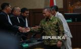 Terdakwa kasus dugaan suap terhadap putusan lepas perkara korupsi pemberian fasilitas ekspor minyak sawit mentah (CPO) Djuyamto (kedua kanan), dan Agam Syarif Baharudin (kanan) berjabat tangan dengan jaksa penuntut umum (JPU) usai menjalani sidang pembacaan putusan di Pengadilan Tipikor, Jakarta, Rabu (3/12/2025). Majelis hakim memvonis ketiga terdakwa mantan hakim yang menjatuhkan vonis lepas (ontslag) terhadap kasus korupsi pemberian fasilitas ekspor minyak sawit mentah (crude palm oil/CPO) yakni Djuyamto, Agam Syarif Baharudin, dan Ali Muhtarom dengan hukuman pidana penjara 11 tahun dan denda Rp500juta subsider enam bulan kurungan. (FOTO : Republika/Thoudy Badai)