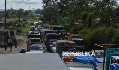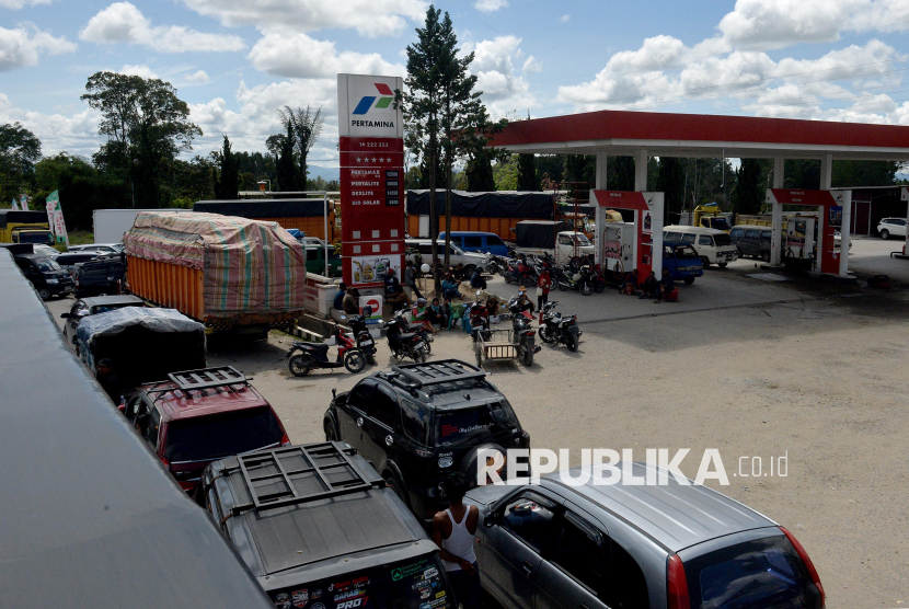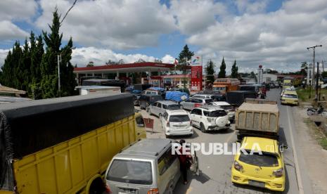 Sejumlah kendaraan antre untuk mendapatkan BBM di SPBU wilayah Doloksanggul, Humbang Hasundutan, Sumatera Utara, Kamis (4/12/2025). Antrean kendaraan mengular di sejumlah SPBU di wilayah Sumatera Utara karena tersendatnya pasokan BBM. Warga harus antre lebih dari dua jam untuk mendapatkan BBM. (FOTO : Edwin Putranto/Republika)