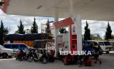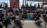 Warga antre untuk mendapatkan BBM di SPBU wilayah Doloksanggul, Humbang Hasundutan, Sumatera Utara, Kamis (4/12/2025). Antrean kendaraan mengular di sejumlah SPBU di wilayah Sumatera Utara karena tersendatnya pasokan BBM. Warga harus antre lebih dari dua jam untuk mendapatkan BBM. (FOTO : Edwin Putranto/Republika)