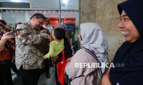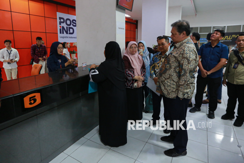 Menteri Koordinator Budang Perekonomian Airlangga Hartarto berbincang dengan warga penerima manfaat dana Bantuan Langsung Tunai Sementara Kesejahteraan Rakyat (BLTS Kesra) di Kantor Pos Premier Rawamangun, Jakarta Timur, Kamis (4/12/2025). Bantuan tunai senilai Rp900 ribu tersebut untuk tiga bulan dari Oktober - Desember dan akan dituntaskan pencairannya hingga akhir Desember mendatang, hingga saat ini pencairan sudah direalisasikan 75 persen. Program BLTS Kesra tersebut menyasar sebanyak 35 juta keluarga penerima manfaat (KPM) kurang mampu yang diharapkan dapat mendorong daya beli masyarakat pada kuartal IV-2025. (FOTO : Republika/Thoudy Badai)