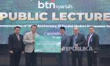 Direktur Utama Bank Syariah Nasional (BSN) Alex Sofjan Noor memberikan kuliah umum di Universitas Darusaalam Gontor, Ponorogo, Madiun, Kamis (4/12/2025). Dalam sharing session berjudul Peran Pesantren Dalam Mendukung Transformasi Ekonomi & Perbankan Syariah di Indonesia tercetus gagasan untuk mengajak para santri muda dapat mendukung sosialisasi literasi keuangan syariah di Indonesia dengan pertimbangan pondok pesantren sebagai pusat edukasi dan literasi keuangan syariah, penggerak UMKM syariah, penguat ekonomi halal dan laboratorium syariah. (FOTO : Dok Republika)