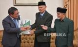 Direktur Utama Bank Syariah Nasional (BSN) Alex Sofjan Noor bersama pimpinan pondok pesantren Gontor KH Hasan Abdullah Sahal di Ponorogo, Madiun, Kamis (4/12/2025). Dirut BSN menjadi pembicara dalam sharing session berjudul Peran Pesantren Dalam Mendukung Transformasi Ekonomi & Perbankan Syariah di Indonesia. (FOTO : Dok Republika)