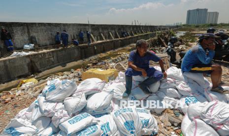 Tanggul Muara Baru yang Bocor Ditambal dengan Tumpukan Karung Pasir