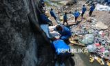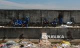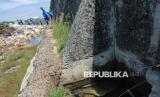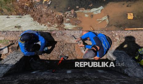 Petugas Sudin SDA Jakarta Utara melakukan penambalan pada tanggul yang bocor imbas pasang maksimu air laut di Tanggul Muara Baru, Jakarta Utara, Jumat (5/12/2025). Pemprov DKI Jakarta melalui BPBD DKI Jakarta mengimbau masyarakat di wilayah pesisir Jakarta Utara untuk waspada terhadap potensi banjir rob yang diprediksi berlangsung dari tanggal 4-6 Desember 2025 sekitar pukul 09.00 WIB. (FOTO : Republika/Thoudy Badai)
