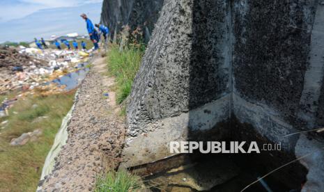 Air laut yang bocor menggenang di antara tanggul laut Muara Baru, Jakarta Utara, Jumat (5/12/2025). Pemprov DKI Jakarta melalui BPBD DKI Jakarta mengimbau masyarakat di wilayah pesisir Jakarta Utara untuk waspada terhadap potensi banjir rob yang diprediksi berlangsung dari tanggal 4-6 Desember 2025 sekitar pukul 09.00 WIB. (FOTO : Republika/Thoudy Badai)