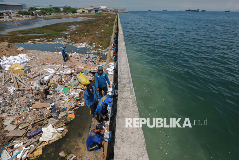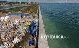 Petugas Sudin SDA Jakarta Utara melakukan penambalan pada tanggul yang bocor imbas pasang maksimu air laut di Tanggul Muara Baru, Jakarta Utara, Jumat (5/12/2025). Tanggul Muara Baru yang sempat mengalami kebocoran pada Kamis (4/12) kemarin, kini sudah diperbaiki oleh petugas untuk menahan laju air sementara sebelum dibangun proyek pembuatan giant sea wall atau National Capital Integrated Coastal Development (NCICD) sepanjang 28,2 kilometer. (FOTO : Republika/Thoudy Badai)
