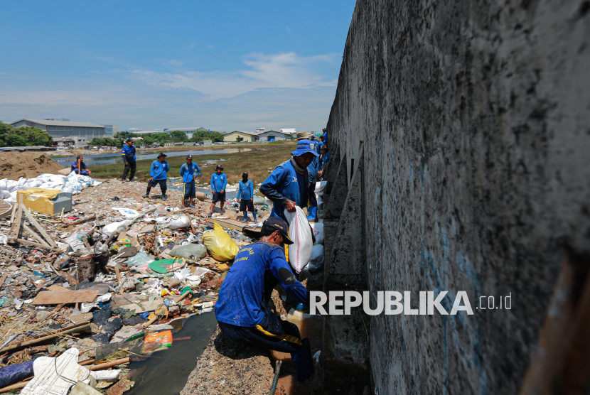 Petugas Sudin SDA Jakarta Utara melakukan penambalan pada tanggul yang bocor imbas pasang maksimu air laut di Tanggul Muara Baru, Jakarta Utara, Jumat (5/12/2025). Banjir rob di wilayah pesisir Jakarta tersebut terjadi akibat fenomena pasang maksimum air laut bersamaan dengan fenomena fase bulan purnama. (FOTO : Republika/Thoudy Badai)