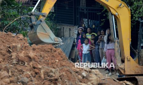 Warga menyaksikan proses evakuasi korban bencana tanah longsor di Aek Manis, Sibolga, Sumatera Utara, Jumat (5/12/2025). Bencana tanah longsor di Aek Manis, Sibolga menewaskan 43 orang warga. Di hari kesembilan proses evakuasi, 42 jenazah korban telah berhasil ditemukan, sedangkan satu jenazah warga lainnya masih dalam pencarian. (FOTO : Edwin Putranto/Republika)