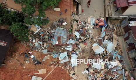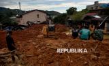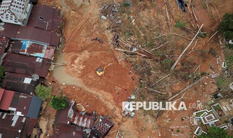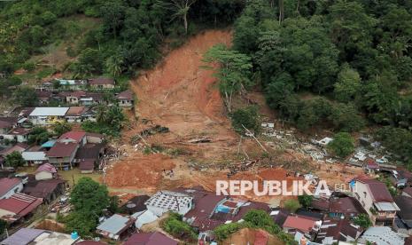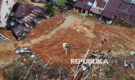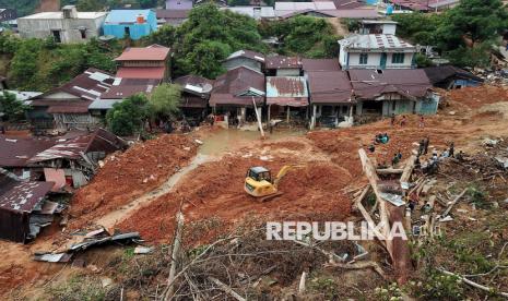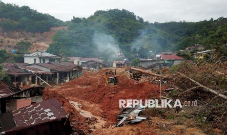 Penampakan bencana tanah longsor di Aek Manis, Sibolga, Sumatera Utara, Jumat (5/12/2025). Bencana tanah longsor di Aek Manis, Sibolga menewaskan 43 orang warga. Di hari kesembilan proses evakuasi, 42 jenazah korban telah berhasil ditemukan, sedangkan satu jenazah warga lainnya masih dalam pencarian. (FOTO : Edwin Putranto/Republika)