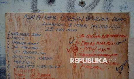 Papan informasi menampilkan data korban bencana tanah longsor di Aek Manis, Sibolga, Sumatera Utara, Jumat (5/12/2025). Bencana tanah longsor di Aek Manis, Sibolga menewaskan 43 orang warga. Di hari kesembilan proses evakuasi, 42 jenazah korban telah berhasil ditemukan, sedangkan satu jenazah warga lainnya masih dalam pencarian. (FOTO : Edwin Putranto/Republika)