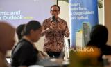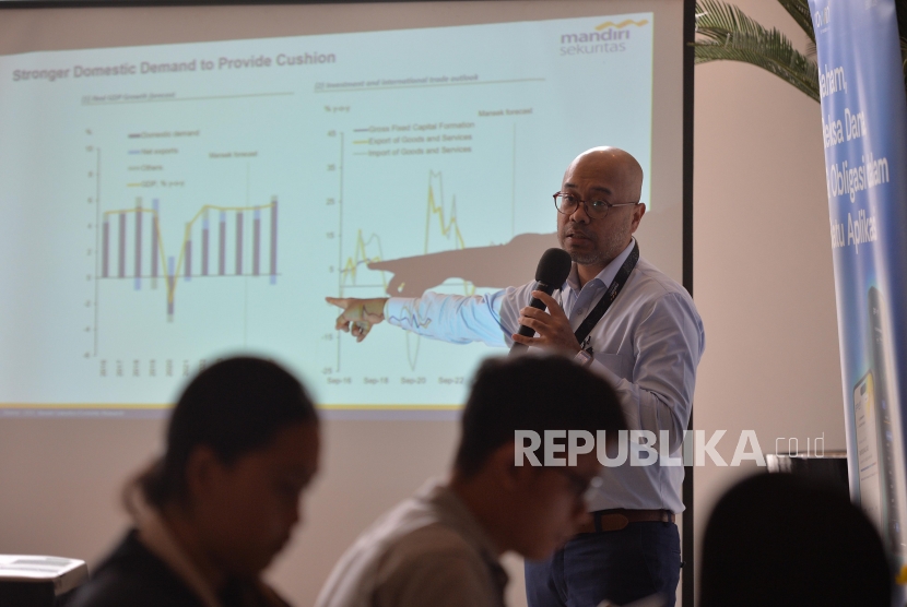 Chief Economist Rangga Cipta menyampaikan paparan dalam Economic and Market Outlook 2026 di Jakarta, Selasa (9/12/2025). Mandiri Sekuritas memproyeksikan optimisme terhadap pasar keuangan domestik pada tahun 2026, yang didorong oleh stabilitas makroekonomi dan transisi pemerintahan yang mulus. Mandiri Sekuritas memprediksi PDB Indonesia akan tumbuh stabil di kisaran 5,0 persen hingga 5,2 persen. Sektor unggulan yang akan menjadi pendorong utama pasar adalah Perbankan Big Caps, Bahan Baku, dan sektor yang terkait dengan Infrastruktur/Hilirsasi. (FOTO : Dok Republika)