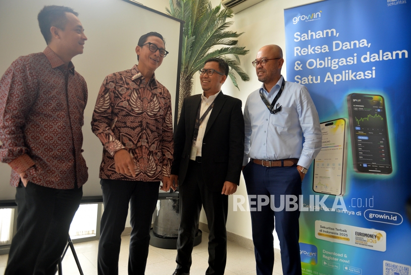 Direktur Utama Mandiri Sekuritas Oki Ramadhana (kedua kiri) bersama Head of Strategy and Equity Analyst Adrian Joezer Head of Fixed Income Analyst Handy Ynunianto dan Chief Economist Rangga Cipta berbincang sebelum Economic and Market Outlook 2026 di Jakarta, Selasa (9/12/2025). Mandiri Sekuritas memproyeksikan optimisme terhadap pasar keuangan domestik pada tahun 2026, yang didorong oleh stabilitas makroekonomi dan transisi pemerintahan yang mulus. Mandiri Sekuritas memprediksi PDB Indonesia akan tumbuh stabil di kisaran 5,0 persen hingga 5,2 persen. Sektor unggulan yang akan menjadi pendorong utama pasar adalah Perbankan Big Caps, Bahan Baku, dan sektor yang terkait dengan Infrastruktur/Hilirsasi. (FOTO : Dok Republika)