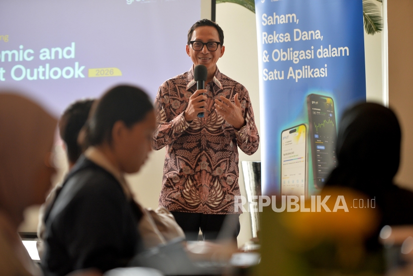 Direktur Utama Mandiri Sekuritas Oki Ramadhana menyampaikan paparan dalam Economic and Market Outlook 2026 di Jakarta, Selasa (9/12/2025). Mandiri Sekuritas memproyeksikan optimisme terhadap pasar keuangan domestik pada tahun 2026, yang didorong oleh stabilitas makroekonomi dan transisi pemerintahan yang mulus. Mandiri Sekuritas memprediksi PDB Indonesia akan tumbuh stabil di kisaran 5,0 persen hingga 5,2 persen. Sektor unggulan yang akan menjadi pendorong utama pasar adalah Perbankan Big Caps, Bahan Baku, dan sektor yang terkait dengan Infrastruktur/Hilirsasi. (FOTO : Dok Republika)