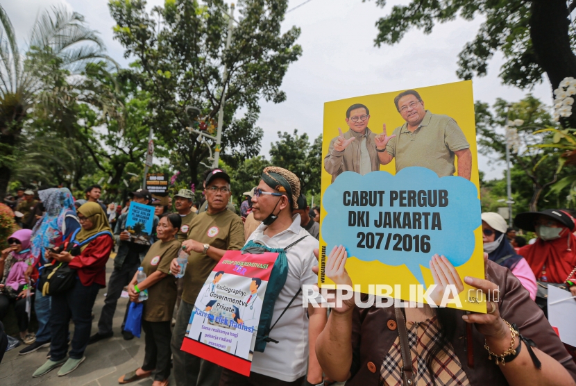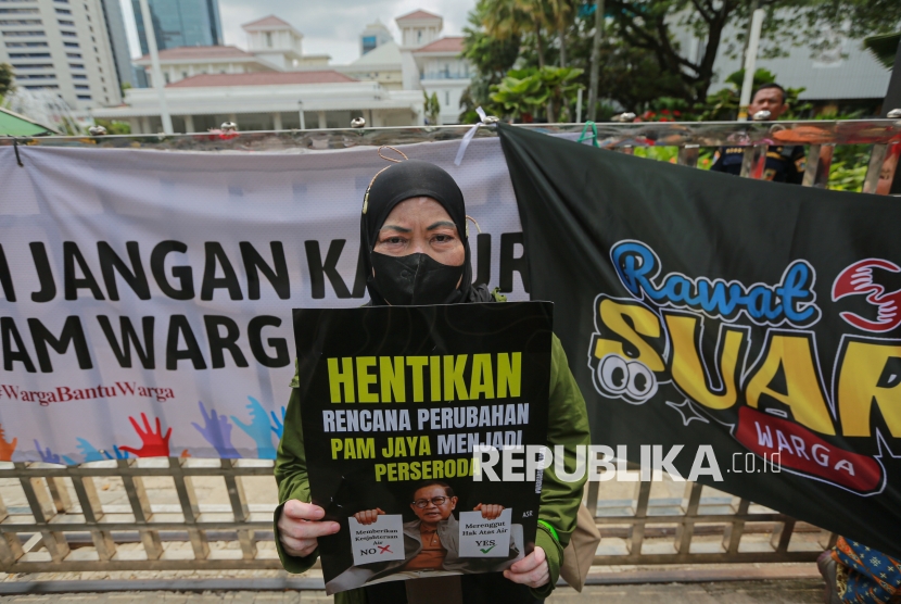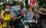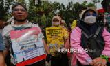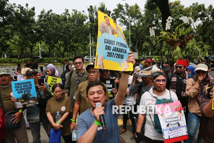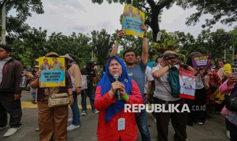 Sejumlah elemen masyarakat menggelar aksi dalam rangka memperingati Hari HAM Sedunia di depan gedung Balai Kota DKI Jakarta, Rabu (10/12/2025). Dalam aksinya massa menolak segala bentuk penggusuran paksa, kriminalisasi terhadap warga, hingga privatisasi air Jakarta. Selain itu warga menuntut Pemprov DKI Jakarta untuk mencabut Pergub DKI Jakarta 207/2016 tentang Penertiban Pemakaian/Penguasaan Tanah Tanpa Izin yang Berhak yang dinilai berpotensi melanggengkan penggusuran paksa yang bertentangan dengan HAM. (FOTO : Republika/Thoudy Badai)
