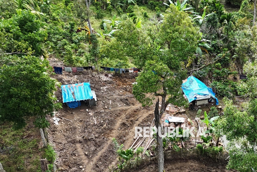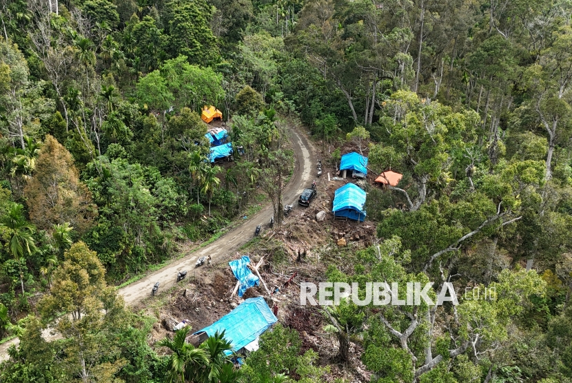 Foto udara Sejumlah tenda darurat milik korban banjir terlihat di kawasan hutan Desa Kuta Teugoh, Beutong Ateuh Banggalang, Nagan Raya, Aceh, Kamis (11/12/2025). Sebagian warga korban banjir dari Desa Babah Suak dan Desa Kuta Teungoh atau 360 kepala keluarga masih mengungsi di dalam hutan disebabkan rumah mereka terbawa arus pasca bencana hidrometeorologi pada Rabu (26/11) lalu. (FOTO : ANTARA FOTO/Syifa Yulinnas)