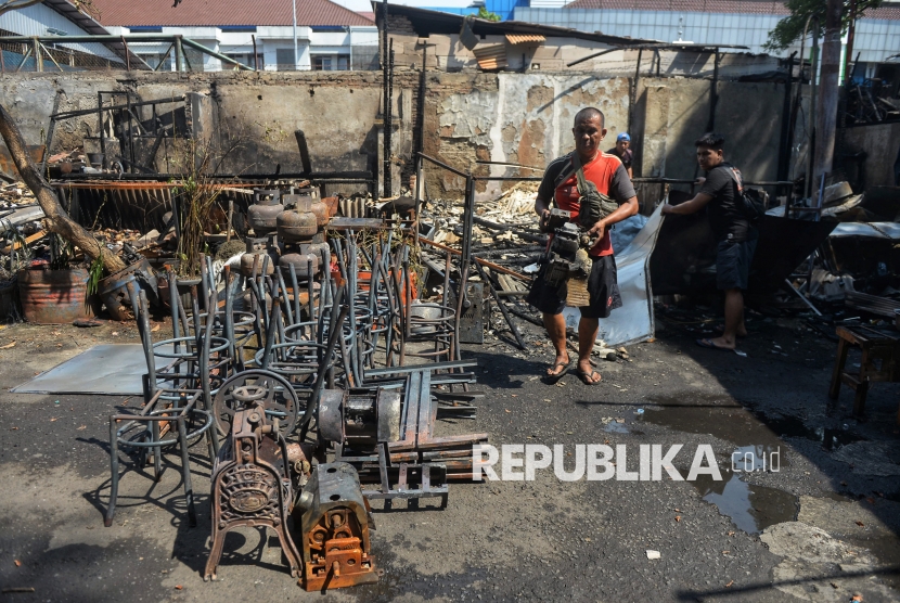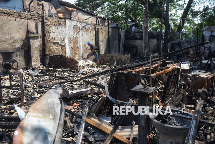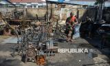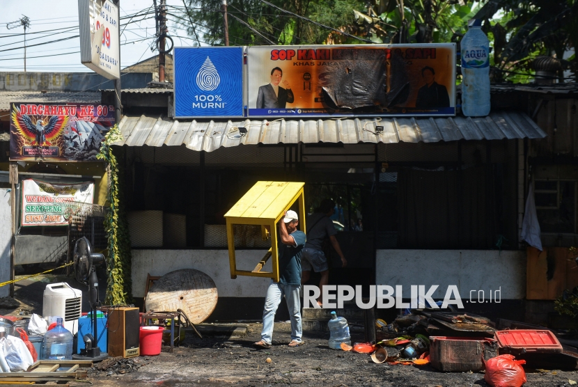 Pedagang membersihkan puing-puing sisa kebakaran di kiosnya pascakericuhan di kawasan Kalibata, Jakarta, Jumat (12/12/2025). Pasca kejadian tersebut, kondisi di lokasi berangsur kondusif. Setidaknya sembilan kios, enam kendaraan roda dua, dan satu kendaraan roda empat dibakar. Kericuhan ini dipicu oleh pengeroyokan terhadap penagih utang lapangan (debt collector) yang dipukuli orang tidak dikenal hingga tewas. (FOTO : Republika/Prayogi)