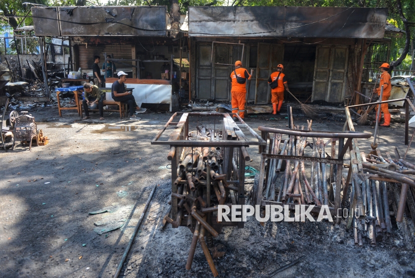 PPSU membersihkan puing-puing sisa kebakaran kios pedagang pascakericuhan di kawasan Kalibata, Jakarta, Jumat (12/12/2025). Pasca kejadian tersebut, kondisi di lokasi berangsur kondusif. Setidaknya sembilan kios, enam kendaraan roda dua, dan satu kendaraan roda empat dibakar. Kericuhan ini dipicu oleh pengeroyokan terhadap penagih utang lapangan (debt collector) yang dipukuli orang tidak dikenal hingga tewas. (FOTO : Republika/Prayogi)