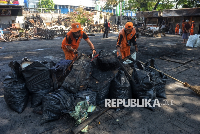 REPUBLIKA.CO.ID, JAKARTA -- Anggota PPSU membersihkan puing-puing sisa kebakaran kios pedagang pascakericuhan di kawasan Kalibata, Jakarta, Jumat (12/12/2025).