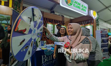 Pengunjung berada di salah satu stan mitra konservasi saat gelaran Pameran Konservasi Spesies Penting Jawa-Bali di Botani Square Mall, Kota Bogor, Jawa Barat, Jumat (12/12/2025). Pameran yang digelar oleh Direktorat Jenderal Konservasi Sumber Daya Alam dan Ekosistem (Ditjen KSDAE) Kementerian Kehutanan bersama Burung Indonesia dan Raptor Indonesia tersebut diikuti oleh 17 unit pelaksana teknis (UPT) Ditjen KSDAE Kementerian Kehutanan dan 13 mitra konservasi yang menampilkan beragam edukasi terkait spesies penting Jawa-Bali seperti Elang Jawa, Badak Jawa, Owa hingga Jalak Bali. Pameran tersebut diharapkan menjadi ruang edukasi bagi warga sekaligus ruang interaksi bersama pegiat konservasi untuk memperkenalkan spesies penting Jawa-Bali sehingga memiliki kesadaran yang sama atas kelestarian lingkungan. (FOTO : Republika/Thoudy Badai)