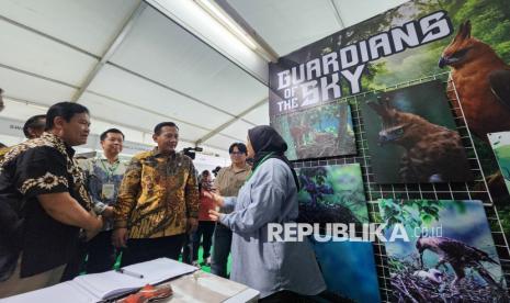 Wakil Memteri Kehutanan Rohmat Maezuki (tengah) berbincang dengan pegiat konservasi Elang Jawa saat menghadiri acara Pameran Konservasi Spesies Penting Jawa-Bali di Botani Square Mall, Kota Bogor, Jawa Barat, Jumat (12/12/2025). Pameran yang digelar oleh Direktorat Jenderal Konservasi Sumber Daya Alam dan Ekosistem (Ditjen KSDAE) Kementerian Kehutanan bersama Burung Indonesia dan Raptor Indonesia tersebut diikuti oleh 17 unit pelaksana teknis (UPT) Ditjen KSDAE Kementerian Kehutanan dan 13 mitra konservasi yang menampilkan beragam edukasi terkait spesies penting Jawa-Bali seperti Elang Jawa, Badak Jawa, Owa hingga Jalak Bali. Pameran tersebut diharapkan menjadi ruang edukasi bagi warga sekaligus ruang interaksi bersama pegiat konservasi untuk memperkenalkan spesies penting Jawa-Bali sehingga memiliki kesadaran yang sama atas kelestarian lingkungan. (FOTO : Republika/Thoudy Badai)