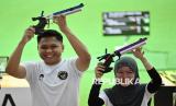 REPUBLIKA.CO.ID, BANGKOK -- Atlet menembak Indonesia Muhammad Iqbal Raia prabowo dan Arista Perdana Putri Darmoyo meraih medali emas pada final nomor 10 meter Air Rifle tim campuran cabang menembak SEA Games 2025 di Photharam Shooting Range, Bangkok, Thailand, Senin (15/12/2025).