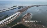 Foto udara suasana pengerjaan proyek pembangunan Jalan Tol Semarang-Demak Seksi 1 di Semarang, Jawa Tengah, Senin (15/12/2025). Kementerian Pekerjaan Umum (PU) mencatat progres konstruksi Jalan Tol Semarang-Demak Seksi 1 sepanjang 10,64 Km dengan dukungan sistem pengendali banjir seperti tanggul laut, rumah pompa dan sejumlah kolam retensi selain untuk memperlancar arus lalu lintas juga untuk melindungi ratusan ribu jiwa dari ancaman banjir rob Kabupaten Demak dan Kota Semarang tersebut telah mencapai 58,31 persen per 24 November 2025 dan ditargetkan beroperasi pada April 2027. (FOTO : ANTARA FOTO/Aprillio Akbar)