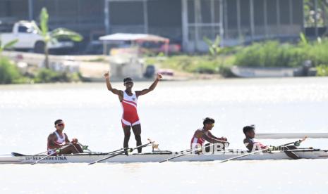 REPUBLIKA.CO.ID, THAILAND -- Tim dayung putra Indonesia Ali Mardiansyah, Ihram, Rafiq Wijdan Yasir, Ardi Isadi mengangkat tangan usai mencapai garis finish pada final nomor Quadruple Sculls dayung SEA Games 2025 di Royal Thai Navy Rowing and Canoeing Training Center, Ban Chang, Rayong, Chon Buri, Thailand, Selasa (16/12/2025).