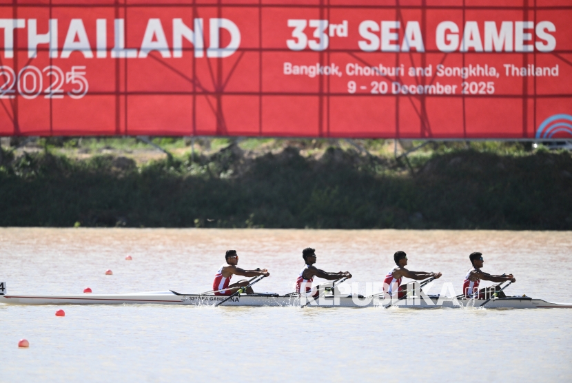 Tim dayung putra Indonesia (dari kiri) Ali Mardiansyah, Ihram, Rafiq Wijdan Yasir, Ardi Isadi memacu kecepatannya pada final nomor Quadruple Sculls dayung SEA Games 2025 di Royal Thai Navy Rowing and Canoeing Training Center, Ban Chang, Rayong, Chon Buri, Thailand, Selasa (16/12/2025). Indonesia berhasil menjadi yang tercepat dengan catatan waktu 6 menit 38,862 detik sehingga berhak atas medalli emas sedangkan medali perak diraih atlet Vietnam dengan catatan waktu 6 menit 43,678 detik dan Thailand meraih medali perunggu dengan catatan waktu 6 menit 48,319 detik. (FOTO : ANTARA FOTO/Nova Wahyudi)