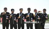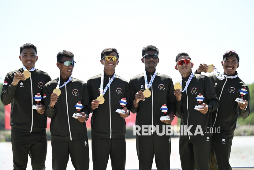 Tim dayung putra Indonesia (dari kiri) M iqbal, Ali Mardiansyah, Ihram, Rafiq Wijdan Yasir, Ardi Isadi, Kakan Kusmana berpose dengan medali emasnya usai upacara penghargaan pemenang (UPP) final nomor Quadruple Sculls dayung SEA Games 2025 di Royal Thai Navy Rowing and Canoeing Training Center, Ban Chang, Rayong, Chon Buri, Thailand, Selasa (16/12/2025). Indonesia berhasil menjadi yang tercepat dengan catatan waktu 6 menit 38,862 detik sehingga berhak atas medalli emas sedangkan medali perak diraih atlet Vietnam dengan catatan waktu 6 menit 43,678 detik dan Thailand meraih medali perunggu dengan catatan waktu 6 menit 48,319 detik. (FOTO : ANTARA FOTO/Nova Wahyudi)