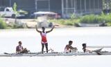 Tim dayung putra Indonesia (dari kiri) Ali Mardiansyah, Ihram, Rafiq Wijdan Yasir, Ardi Isadi mengangkat tangan usai mencapai garis finish pada final nomor Quadruple Sculls dayung SEA Games 2025 di Royal Thai Navy Rowing and Canoeing Training Center, Ban Chang, Rayong, Chon Buri, Thailand, Selasa (16/12/2025). Indonesia berhasil menjadi yang tercepat dengan catatan waktu 6 menit 38,862 detik sehingga berhak atas medalli emas sedangkan medali perak diraih atlet Vietnam dengan catatan waktu 6 menit 43,678 detik dan Thailand meraih medali perunggu dengan catatan waktu 6 menit 48,319 detik. (FOTO : ANTARA FOTO/Nova Wahyudi)