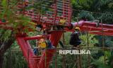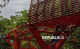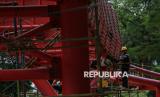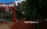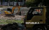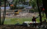 Pekerja beraktivitas di area proyek revitalisasi Taman Ayodya dan Taman Langsat di Jakarta Selatan, Rabu (17/12/2025). Revitalisasi yang menggabungkan tiga taman eksisting tersebut yakni Taman Leuser, Taman Ayodya, dan Taman Langsat akan dijadikan satu kawasan hijau terpadu dengan jembatan penghubung bernama Taman Bendera Pusaka. Kawasan ini nantinya akan dilengkapi fasilitas rekreasi dan olahraga yang mendukung gaya hidup sehat serta berfungsi sebagai pengendali banjir di wilayah sekitar. Pembangunan revitalisasi Taman Bendera Pusaka tersebut ditargetkan rampung pada awal tahun 2026 mendatang. (FOTO : Republika/Thoudy Badai)