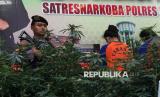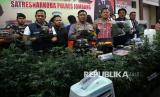 REPUBLIKA.CO.ID, JOMBANG -- Petugas menunjukkan barang bukti tanaman ganja yang dibudidayakan di dalam rumah kontrakan saat rilis di Polres Jombang, Jawa Timur, Kamis (18/12/2025).