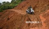 Warga melintasi jalan yang tertimbun longsor di Nagari Anduriang, Kayu Tanam, Padang Pariaman, Sumatera Barat, Sabtu (27/12/2025). Jalan longsor sejak tiga pekan lalu itu dibuka secara gotong-royong oleh masyarakat setempat agar dapat dilewati, namun kondisi curah hujan tinggi dan longsor susulan membuat jalan penghubung kecamatan Lubuk Alung dan Kayu Tanam itu semakin berbahaya dilewati roda dua. (FOTO : ANTARA FOTO/Iggoy el Fitra)