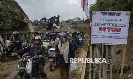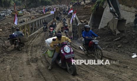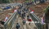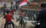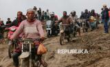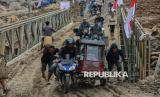 Warga mendorong motor yang terjebak lumpur saat melintas di Jalan Eks Simpang KKA, Bener Meriah, Aceh, Jumat (26/12/2025). Akses transportasi antar wilayah yang menghubungkan kawasan Bener Meriah menuju Takengon, Aceh Tengah kini kembali tersambung usai jembatan Bailey Weh Paseh tuntas dibangun. Sebelumnya kawasan tersebut sempat putus akibat diterjang banjir bandang dan longsor pada akhir November 2025 lalu. (FOTO : Republika/Thoudy Badai)