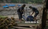 Petani durian seusai menaiki jembatan sling baja melintasi sungai Peusangan di kawasan Simpang Rahmat, Bener Meriah, Aceh. Memanfaatkan kabel listrik yang terputus, sejumlah warga berinisiatif membuat lintasan gantung atau kereta gantung penyeberangan yang digunakan untuk akses mobilitas warga antar kabupaten. (FOTO : Republika/Thoudy Badai)
