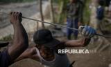 Warga menarik kebel sling untuk penyeberangan melintasi sungai Peusangan di kawasan Simpang Rahmat, Bener Meriah, Aceh. Jembatan sling tersebut dibangun sebagai akses darurat warga, pedagang dan petani pascabencana banjir bandang untuk jalur mobilitas antar kawasan Kabupaten Bener Meriah dan Kabupaten Aceh Tengah. (FOTO : Republika/Thoudy Badai)