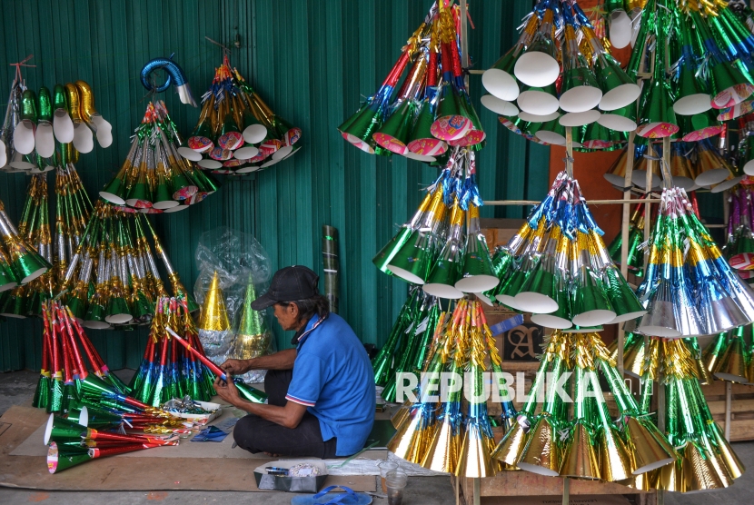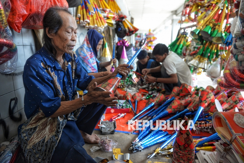 Pedagang menyelesaikan pembuatan terompet yang dijual di kawasan Jalan Pintu Besar Selatan, Glodok, Jakarta, Selasa (30/12/2025). Menurut pedagang, penjualan terompet tahun ini cenderung sepi dan lesu. Biasanya mereka mampu memproduksi hingga 1.000 terompet, namun tahun ini hanya sekitar 600 buah. Hingga hari ini, penjualan baru mencapai sekitar 200 terompet sejak mulai berdagang pada 6 Desember lalu, sebagian besar dijual kepada pedagang langganan. (FOTO : Republika/Prayogi)