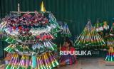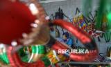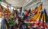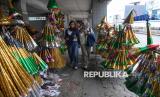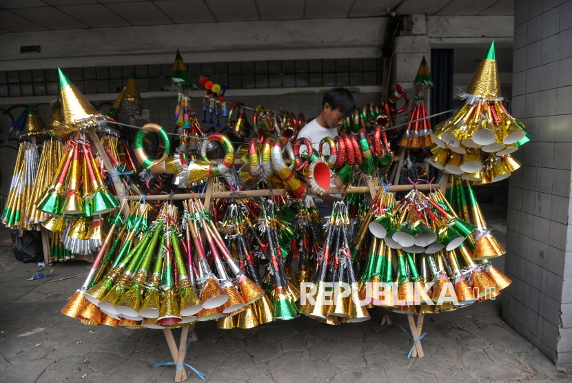 Pedagang menata terompet yang dijual di kawasan Jalan Pintu Besar Selatan, Glodok, Jakarta, Selasa (30/12/2025). Menurut penjual hingga hari ini, penjualan baru mencapai sekitar 200 terompet sejak mulai berdagang pada 6 Desember lalu, sebagian besar dijual kepada pedagang langganan. Dengan modal awal sekitar Rp2,5 juta, mereka mengaku belum mencapai titik balik modal, berbeda dengan tahun lalu yang telah kembali sekitar setengahnya. (FOTO : Republika/Prayogi)