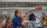 Pedagang terompet Lantur mencoba terompet dagangannya di kawasan Jalan Pintu Besar Selatan, Glodok, Jakarta, Selasa (30/12/2025). Rojali dan Lantur, pedagang terompet asal Cikarang, telah berjualan terompet musiman di lokasi itu selama sekitar 20 tahun. Menurut mereka, penjualan terompet tahun ini cenderung sepi dan lesu. (FOTO : Republika/Prayogi)